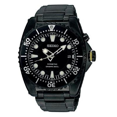 SEIKO Men's 20 ATM Black Stainless Steel Kinetic Diver Watch with Black Dial. Model: SKA427P1. Solid brushed and polished black ion plated stainless steel case (43mm diameter by 14mm thick) and bracelet. Black dial with luminous silver toned hands and hour markers. Rotating bezel and date display features. Advanced precisely tuned Japanese Kinetic movement with an automatic power generator. Power reserve indicator with a capacitor that can power the watch for up to 6 months when not being used. Screw-down crown on the left side for diving. Finely crafted smooth scratch resistant Hardlex crystal. Fold-over push-button deployment type clasp. Water resistant up to 200 meters. Attractive Gift Box included. One Year Limited Warranty. MSRP:5.00